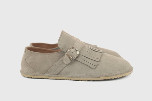 An edgy shoe design, decorated with a fringe and a strap with a silver buckle. Comfortable as an everyday shoe but can easily be dressed up for a night out
